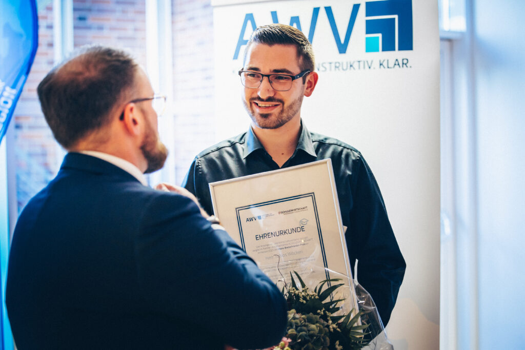 Tobias Wäcken Für seinen bemerkenswerten Bildungsweg wurde in diesem Jahr Tobias Wäcken mit dem mit 1.250 Euro dotierten Preis ausgezeichnet. Er beendete im Juni seine Umschulung zum Industriekaufmann bei der Hase Safety Gloves GmbH. Aufgrund persönlicher Gründe kam es zu einer beruflichen Neuorientierung, die er mit beeindruckender Entschlossenheit annahm. AWV-Hauptgeschäftsführer Henning Wessels betonte in der Laudatio, sein Engagement im Rahmen eines Projektes zur Entwicklung neuer Produkte auf Basis einer hautfreundlichen Faser – aufgrund einer persönlichen Verbindung zeigte er großes Gespür für die Anforderungen an das Produkt. Tobias Wäcken engagiert sich darüber hinaus ehrenamtlich in einem Fußballverein und strebt beruflich eine Weiterbildung zum Handelsfachwirt an.